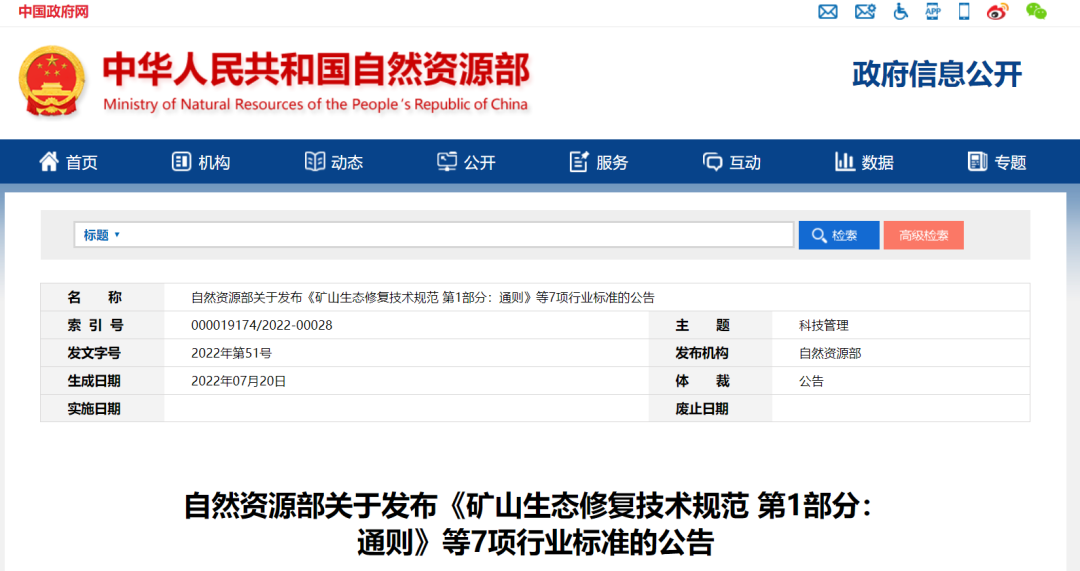 自然资源部关于发布《矿山生态修复技术规范 》7项系列行业标准